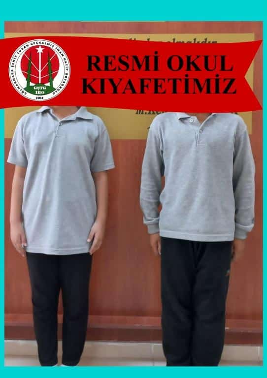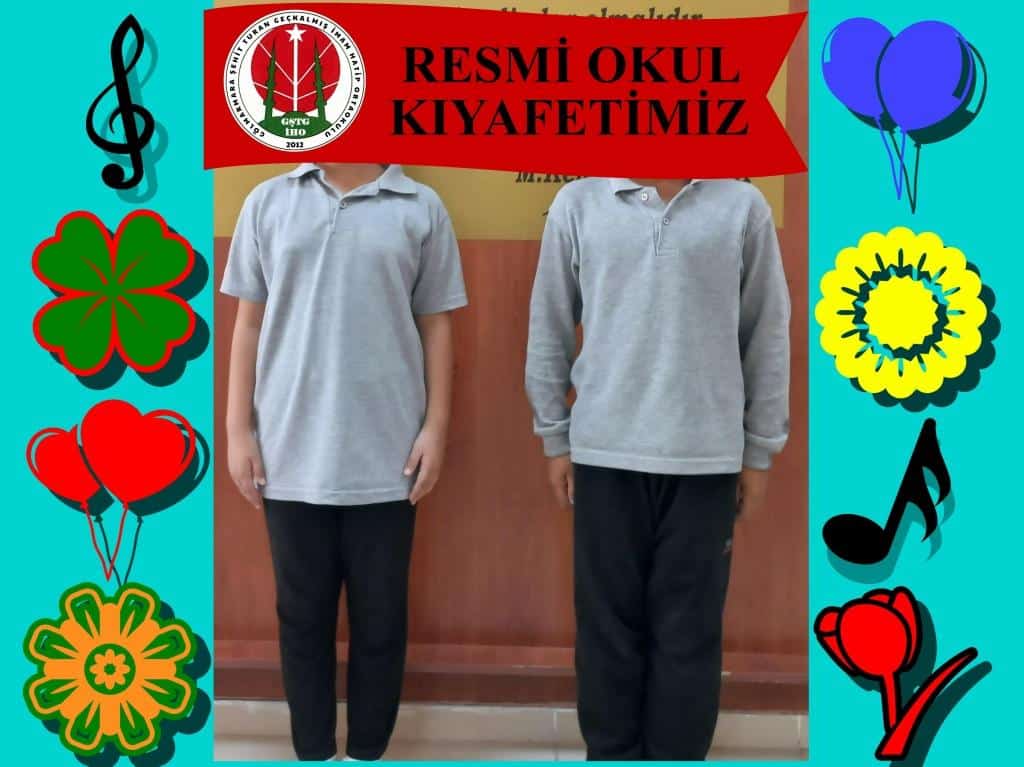 Sayın velilerimiz, ''Milli Eğitim Bakanlığına Bağlı Okul Öğrencilerinin Kılık Kıyafetlerine Dair Yönetmelik'' gereği okulumuz öğrencilerinin giyeceği kıyafetler örnek fotoğraflardaki gibi yakalı gri tişört ve siyah pantolondan oluşmaktadır. Bunların dışında okulumuza ait başka bir kıyafet uygulaması bulunmamaktadır. Bu kıyafetler, aksi karar alınmadığı sürece 2025-2026 eğitim öğretim yılında da geçerli olacaktır. Okulumuzda kıyafet satışı yapılmamaktadır. Kıyafetleri istediğiniz yerden temin edebilirsiniz.